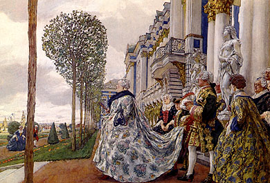 Сколь выразительно "обнажает" парадный регулярный характер придворцовой части царскосельского парка эта неизданная иллюстрация Евгения Лансере для книги А.Н.Бенуа "Царское Село в царствование императрицы Елизаветы Петровны". Четкие линии газонов, геометризм стриженых пирамидальных и шаровидных кустов, прямизна стволов выстроившихся в ряд деревьев с их прозрачными сферическими кронами наверху - весь этот подчеркнуто строгий, почти аскетического вида садовый антураж подан в резком контрасте с пышным великолепием барочных "излишеств" архитектуры и поистине театральным богатством царского выхода. Лансере, как и его старшие друзья по "Миру искусства" Александр Бенуа и Константин Сомов, акцентирует эту театральность садово-парковой жизни XVIII века, особенно ощущавшуюся в эпоху царствования Елизаветы Петровны. Эта императрица даже требовала от придворных и гостей подготовки особых одеяний для приемов в своих загородных резиденциях.