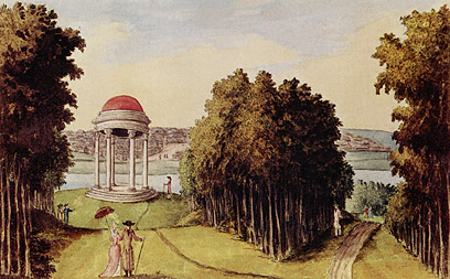 Писатель, художник, теоретик и практик садово-паркового искусства Андрей Тимофеевич Болотов принадлежал к тому типу замечательных русских людей, в которых соединялись самые различные дарования. Поистине, это был российский homo universale. Вот что писал о Болотове Александр Бенуа в книге "Мои воспоминания": "...милейший и культурнейший для своего времени человек <...> он состоял в течение многих лет управляющим разными крупными имениями и, наконец, имением внебрачного сына Екатерины II - графа Бобринского". Акварель с видом имения в Богородицке, довольно наивная по живописи, в познавательном смысле весьма интересна, поскольку отлично передает очарование и особенности богатого поместья тех лет. Главный объект внимания художника - стоящая на холме обзорная беседка с ярко-красной крышей, обязательная для парков той поры. Интересно отметить, что, в отличие от европейских садов, в которых беседки, как правило, располагались в густых зеленых кущах, в российских парках для беседок отводились возвышенные места, что позволяло любоваться прекрасными видами.