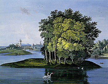 В 1776 году Семен Щедрин, вернувшийся в Россию из Италии, где он провел семь лет, был направлен в "Кабинет ее величества" писать виды дворцов и парков. Первые виды Царского Села, к коим принадлежит и данный пейзаж, отличают суховатая, почти жесткая манера письма, некая застылость, как бы отсутствие воздушной атмосферы. Все говорит о том, что художник еще "не вошел" в русскую природу, столь несхожую с природой Италии. "Вид острова..." интересен с точки зрения историко-познавательной, так как позволяет почувствовать характер развлекательных садовых "затей" Петра I, которыми царь удивлял когда-то гостей в Царском Селе, Петергофе и Летнем саду. Быть может, и этот островок предназначался для царских забав, подобных той, что описана современником: "...устроена в куще деревьев небольшая беседка, окруженная со всех сторон водою; где обыкновенно проводит время царь, когда желает быть один или когда хочет кого-нибудь хорошенько напоить, потому что уйти оттуда нет никакой возможности, как скоро отчалит стоящий вблизи ботик, на котором переправляются к беседке".