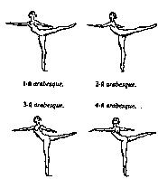 ARABESQUE (арабеск, франц. букв. - арабский), одна из осн. поз классич. танца, отличие к-рой - поднятая назад нога с вытянутым (а не согнутым, как в позе attitude) коленом. В рус. школе классич. танца приняты четыре вида А. (см. стр. 539). I и II А. - ноги в положении efface. В I A. - рука, соответствующая опорной ноге, вытянута вперёд, голова направлена к ней, другая рука отведена в сторону, кисти обращены ладонями вниз, корпус слегка наклонён, но спина вогнута (это относится и к др. видам А.). Во II А. - вперёд направлена рука, соответствующая поднятой ноге, др. отведена в сторону и иногда виднеется из-за спины. Голова повёрнута к зрителям. III и IV А. - ноги в положении croise. В III А. - соответствующая поднятой ноге рука устремляется вперёд, к ней направлен взгляд, другая рука отведена в сторону. В IV А. - впереди рука, противоположная поднятой ноге. Корпус развёрнут спиной к зрителю. Линия руки переходит в линию плеч и продлевается другой рукой. А. исполняется на вытянутой ноге, в plie, 11.1 полупальцах, на пуантах, в прыжке, с поворотом и вращениями Позу можно бесконечно варьировать. Изменения в позициях ног и рук, положении спины, головы. направленности взгляда влечёт за собой преображение выразительной сути А.