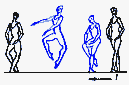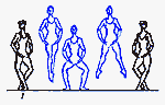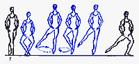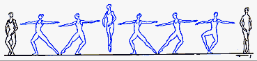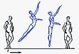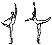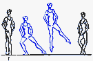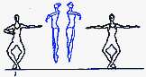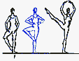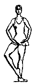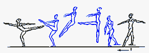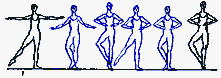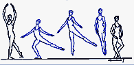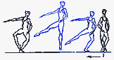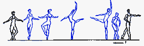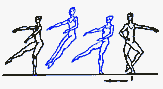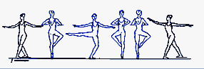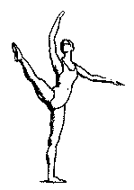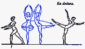 в V позицию. Существуют сложные формы: D. passe (проходящее) - после D. нога сгибается, носок подводится к колену, не касаясь его, и снова вытягивается в нужном направлении; D. ballotte (качающееся) - поднятая нога резким движением чуть опускается и снова возвращается в прежнее положение или отводится в сторону на 1/2 или 1/4 круга и приводится в ту же позицию; D. tombe (падающее) - поднятая нога, как бы перешагивая через преграду, падает на пол, увлекая за собой корпус, опорная с оттянутым носком упирается в пол или поднимается.