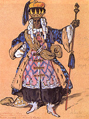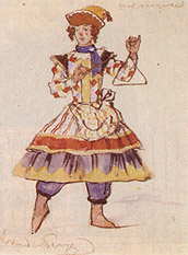 | Эскиз костюма к балету "Павильон Армиды". Худ. А. Бенуа | Эскиз костюма к балету "Петрушка". Худ. А. Бенуа. |