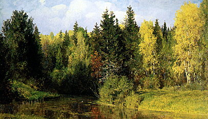"Осень в Абрамцеве" - один из первых поленовских пейзажей большого стиля. Девственная нетронутая природа одержала здесь полную победу. Произошло окончательное обращение Поленова к "чистому" пейзажу и отход от пейзажно-бытового жанра 70-х годов. На картине изображен глухой уголок леса у реки, которая как бы остановилась в своем течении, чтобы не нарушать безмолвия и тишины. Сплошной стеной встает перед зрителем густой лес. Восторженное преклонение художника перед красотой природы определяет весь строй пейзажного образа, торжественного, картинно развернутого на зрителя, организованного размеренными вертикальными ритмами высоких деревьев, написанного на большом горизонтально вытянутом холсте. Это настоящий гимн в честь пламенеющей осени, сказочно преображающей скромную природу Подмосковья: сочетание еще не поблекших красок лета и звонких красок осени придает ликующую праздничность колориту картины.