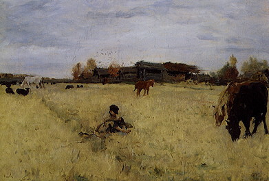 Самое значительное, что создал Серов в 90-е годы в области пейзажной живописи, - это деревенские пейзажи и лучший среди них - "Октябрь. Домотканово". Деревенские пейзажи Серова тесно связаны с бытом крестьянина и так же просты по своим мотивам, как прост этот быт. "Надо, чтобы мужик понимал, - говорил Серов И.Э.Грабарю, - а не барин, а мы всё для бар пишем и ужасно падки на всякую затейливость и пышность". Передний план с изображением сжатого поля и пасущегося на нем стада в картине растянут и замкнут в глубине избами и сараями. Серов не стремится к созданию широких панорамных видов, его природа наделена скромным внешним обликом и очень соразмерна человеку, не подавляя его своим величием. В картине ничего не происходит - пастушок, сидя на земле, деловито чинит хомут, едва переступают с ноги на ногу, жуя сено, лошади - течет обычная мирная деревенская жизнь. Неяркие краски пейзажа, приглушенные рассеянным светом осеннего дня, соответствуют всему характеру изображения.
