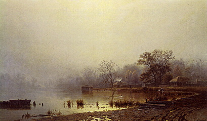 Эта картина - одно из самых значительных произведений Каменева, следовавшего по стопам своего учителя Саврасова, но сохранявшего особое восприятие природы, в котором сказывался интимно-лирический, мягкий характер его дарования, его тонкое ощущение красоты природы. Предметом изображения в картине стал туман, который легкой пеленой окутывает весь пейзаж: размытый дождем берег на переднем плане, пруд, обрамленный у берегов тонкой полосой порыжевшего камыша, деревья дальнего берега, среди которых нашли приют два домика. Солнце, скрытое туманом, распространяет по всему полотну мягкое свечение, окрашивающее туман и постепенно гаснущее к краям картины, но вспыхивающее вновь отражением в тихой воде пруда. Каменев уже отошел от академического романтизма, и поэтому световые явления в его пейзажах - это явления самой природы, правдиво и тонко переданные.