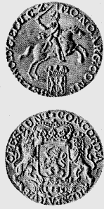 ДУКАТОН (от итал. ducatone), серебр. монета, чеканившаяся в Гельдерне и Фризии в 1582-1585 с ч. в. 22,98 г при о. в. 27,13 г. Исп. Нидерланды ввели у себя Д. в 1618 как серебр. эквивалент дукату; он равнялся 3 гульденам и имел ч. в. 30 г, позже 28,88 г при о. в. 32,5 г. Л. с.- всадник, скачущий направо (отсюда гол. назв. "zilveren rijder", нем. "silberner Reiter"-серебр. всадник), о. с. в Юж. Нидерландах - исп., позже австр. гербовый щит между двумя львами. Чеканка этой крупной (величиной с талер) и высокохуд. серебр. монеты продолжалась в Юж. Нидерландах и в Соединен, провинциях (Голландия) до 1792.