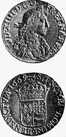СЕРЕБРЯНЫЙ ЭКЮ, экю блан (франц. ecu d'argent, ecu blanc - серебр.- белый щит; в немецкоязыч. странах известен под назв. "талер"), первая монета Франции, соответствовавшая талеровому типу. Введенная в 1641 одновременно с луидором, она равнялась 60 солям. Ч. в. 23,73 г серебра при о. в. 25,98 г. В целях получения дополнит, средств для многочисл. войн, к-рые Франция вела в эпоху абсолютизма (Людовик XIV, 1661-1715), С. э. неоднократно ухудшался, причем каждый раз менялся его тип: 1-й, 2-й, 3-й, 4-й, 6-й типы (1643-1686): л. с.- портрет короля с признаками возраста, о. с.- коронов. щит с лилиями, 5-й тип (1679-1694), получивший назв. "ecu du parlement" (франц.-"парламентский экю"): над головой короля голубь с воспа-ряющимся освященным елеем; 7-й тип (1690- 1693), получивший назв. "ecu aux huit L" (франц.-"экю с 8 "L"): по 4 коронов. двойных "L" в двойном кресте и буквен. мон. знак в окружении лилий; 8-й тип (1694-1698), получивший назв. "ecu aux palmes" (франц.- "пальмовый экю"): щит с лилиями между двумя пальмовыми ветвями; почти все монеты этого типа - результат перечеканки монет 7-го типа; 9-й тип (1701-1703), получивший назв. "ecu aux insignes" (франц.-"экю с регалиями"): щит с 2 коронов. скипетрами; 10-й тип (1704), получивший также назв. "ecu aux huit L": в центре щит, остальное, как у 7-го типа; 11-й тип (1709-1715), получивший назв. "ecu aux trois couronnes" (франц.-"экю с 3 коронами"): 3 короны и 3 лилии, образующие лист клевера, в центре - буквен. мон. знак. Преемником этих типов стал лаубталер (франц. ecu neuf-новый экю). В каждом типе чеканились также монеты в 1/2, 1/4, 1/8 и 1/16 экю.