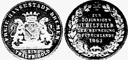 Германия, вольный ганзейский г. Бремен, 1 талер золота в серебре (=1/5 луидора) 1863