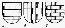 Гербовые щиты: а-шахматная доска; б-разделенный гонтами; в-разделенный брусками