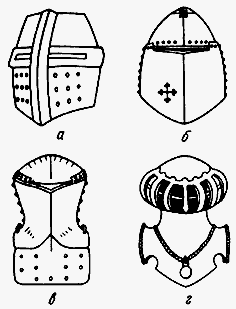 Формы геральдических шлемов: а-полусферич.; б-сфероконич.; в-турнирный; г-с дужками