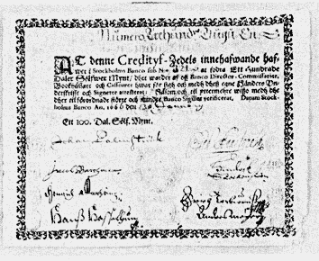 Швеция, Стокгольм, банк Иохана Пальмструка, один из первых бум. Ден. Знаков от 30 янв. 1666 в 100 талеров серебром