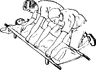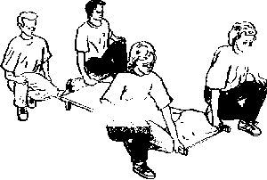 В редких случаях, когда пострадавшего надо перенести на носилках на значительное расстояние, следует придерживаться предложенных здесь правил. Самый опытный из оказывающих первую медицинскую помощь должен координировать действия других, отдавая команды.