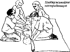 4. С каждой стороны пострадавшей садятся на корточки по два человека, у туловища и ног, и крепко берутся за валики.