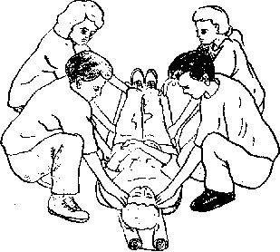 2. Каждый из несущих носилки садится на корточки и крепко берется за ручку. По команде они все поднимаются и стоят, держа носилки на одном уровне.