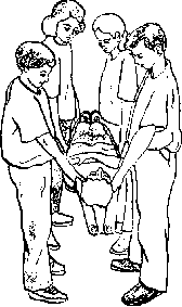 4. Когда носилки надо опустить, все останавливаются по команде. При следующей команде они опускаются на корточки и осторожно ставят носилки на землю.