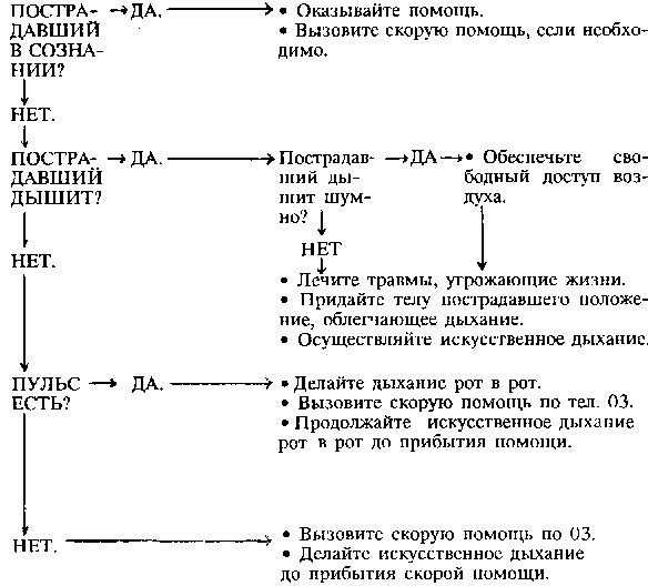 В любой ситуации вы должны предпринять три важных шага: выявить опасность, устранить любую опасность, осмотреть пострадавшего. Только после этого вы можете пользоваться планом, приведенным ниже, чтобы решить, что предпринять.