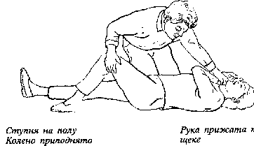 2. Другую руку пострадавшего перекиньте через грудь и расположите ее под его щекой, ладонью наружу. Обхватив дальнее по отношению к вам колено пострадавшего, поднимите его, не отрывая ступни от пола.