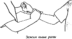 1. Освободите рану от одежды и пережмите место над раной пальцами или рукой. Предпочтительно применение перевязочного материала.