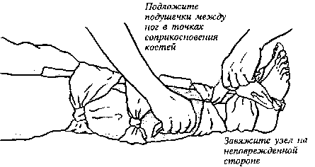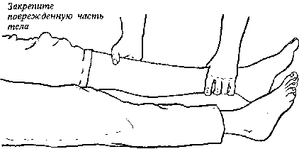 3. В случае перелома ноги свяжите обе ноги вместе в коленях и в лодыжках, а затем - выше и ниже перелома. В случае перелома руки используйте ремень. Если необходимо наложить повязку вокруг руки и тела, не затрагивайте поврежденное место.