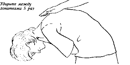 1. Наклоните пострадавшего вперед, пять раз ударьте его плоской поверхностью руки между лопатками.