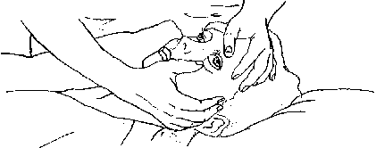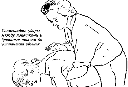 4. Если это не помогает устранить препятствие, мешающее дышать, продолжайте делать удары между лопатками (5 раз) и брюшные толчки (5 раз).