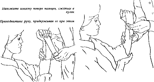1. Аккуратно прижмите стерильную повязку или чистую салфетку к ладони и попросите пострадавшего сжать пальцы в кулак. Если ему трудно это сделать, он может помочь себе неповрежденной рукой.