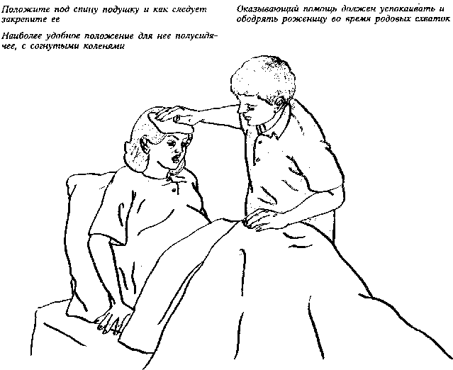 Будущая мать, как правило, взволнована и нервничает. Успокойте ее. Создайте тишину и позовите на помощь кого-нибудь из женщин. Если отец выражает желание остаться и помогать, то ему лучше всего находиться у головы роженицы, поддерживая ее во время схваток. Если женщина находится вне дома, помогите ей принять полусидячее положение на полу, на сиденье машины и т. д.