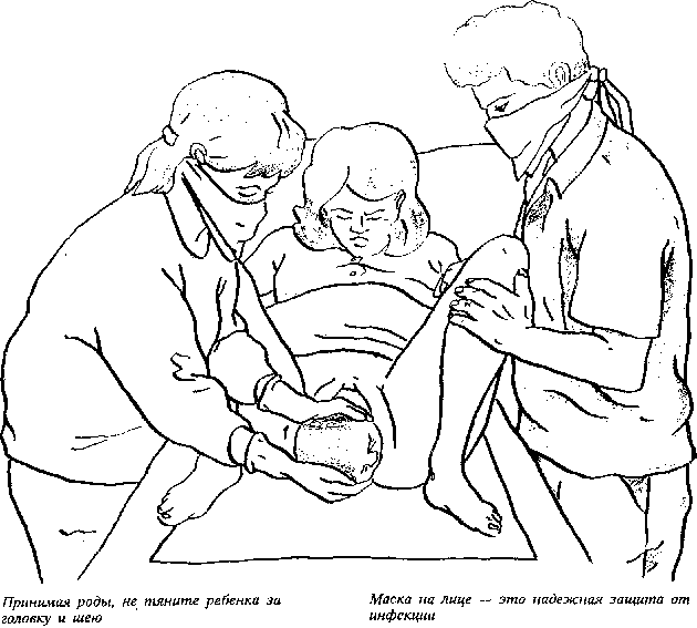 Сокращение мышц матки и давление головки ребенка заставляют расширяться шейку матки. Затем головка выталкивается из матки во влагалище, а за ней и тело ребенка, который продолжает быть связан с матерью пуповиной. Оказывающему первую помощь не обязательно разрезать ее, так как через несколько минут из матки выйдет основная часть пупочного канатика и плацента.