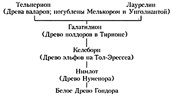 Также из легенд известно, что в Гондолине, при дворе князя Тургона, высились Белтил и Глингал - искусно выточенные подобия Древ валаров. Если составлять "генеалогическое древо" Тельпериона и Лаурелин, оно выглядело бы так: