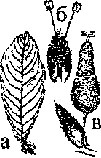 Рис. 4. Ива серая: а - лист, б - мужской цветок, в - женский цветок