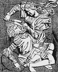 Библейская Далила срезает Самсону волосы - средоточие его силы (резьба по дереву, 1527 г.)