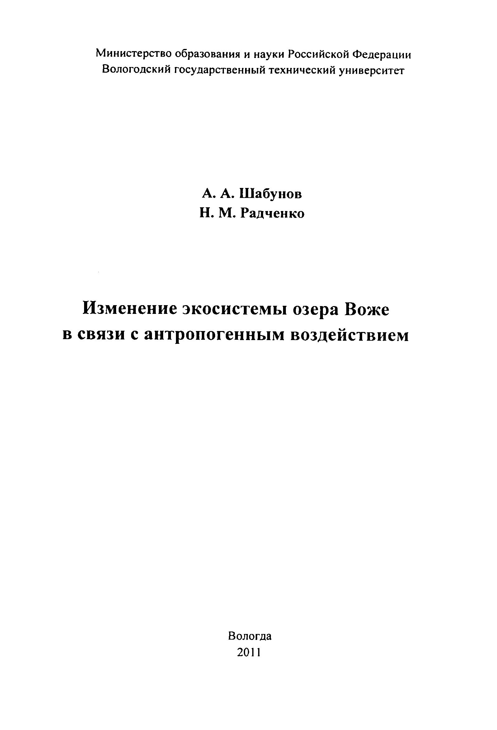Шабунов А.А. Изменение экосистемы озера Воже в связи с антропогенным воздействием : моногр. / А.А. Шабунов, Н.М. Радченко. – Вологда : ВоГТУ, 2011. – 83 с. : ил.