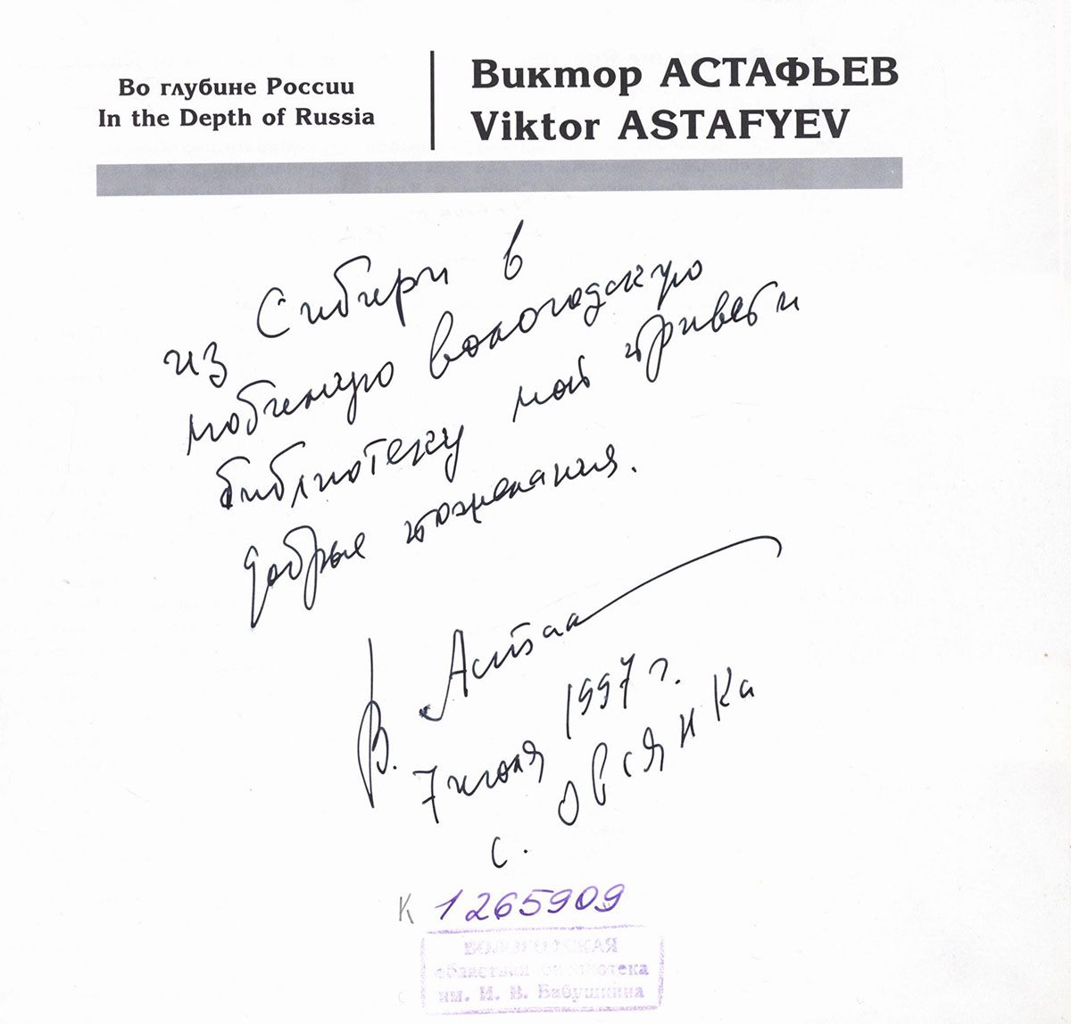 Автограф на книге «Во глубине России. Виктор Астафьев» (Красноярск, б. г.)