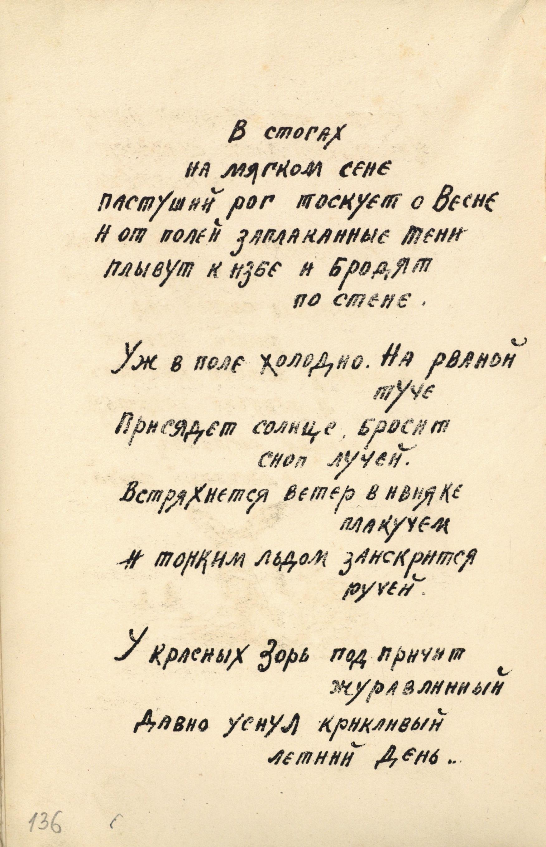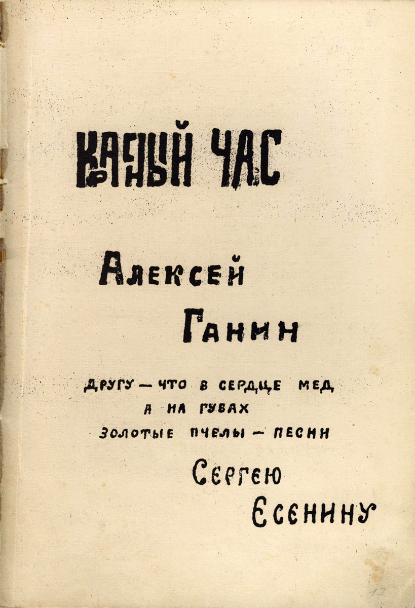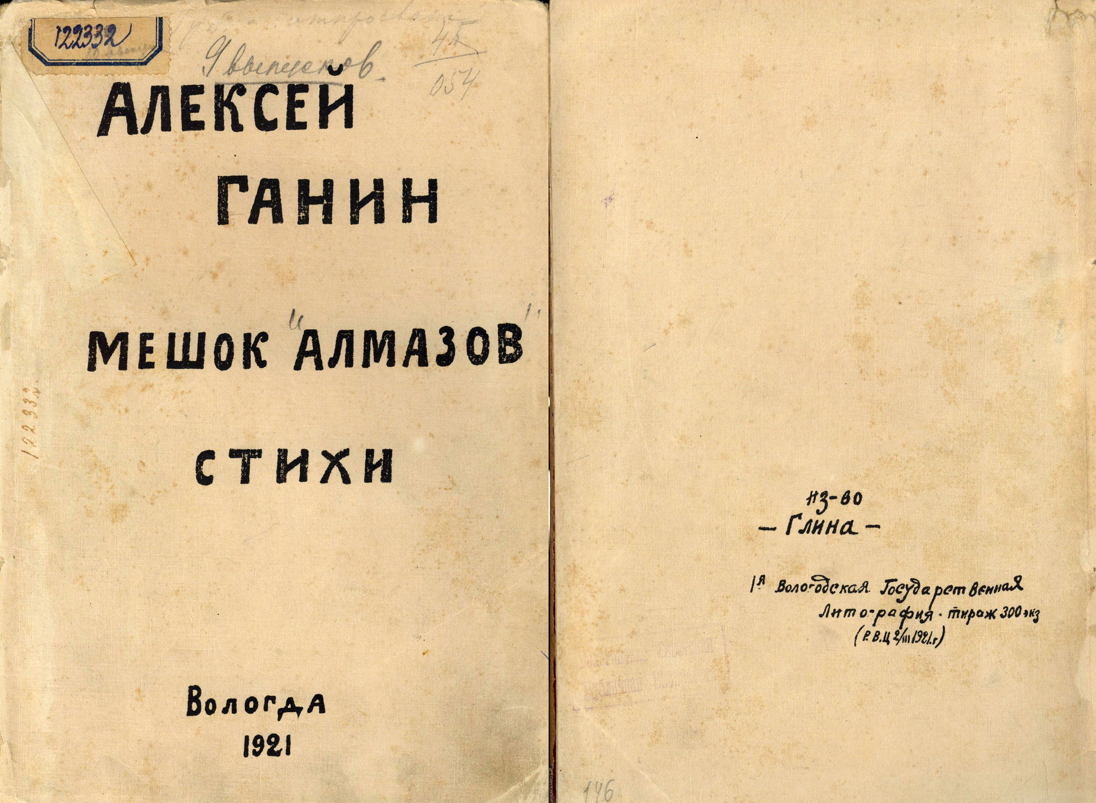 Итак, в 1920-1921 годах литографским способом Алексей Ганин выпустил одиннадцать книг: «Вечер», «В огне и славе», «Золотое безлюдье», «Красный час», «Раскованный мир», «Сарай», «Священный клич», «Облачные кони», «Певучий берег», «Мешок алмазов», «Кибураба». Причем книга «Красный час», посвященная Сергею Есенину, – «другу, что в сердце мед, а на губах золотые пчелы – песни» (так написано в посвящении на обложке книги) была выпущена дважды – в 1920 и в 1921 году. Нумерация страниц в книгах отсутствовала, они не были скреплены, а были согнуты пополам четырьмя листами плотной желтой лощеной бумаги. На последней странице этих самодельных книг имелось название издательства – «Глина». Обследование архивных дел Вологодского отдела по делам издательств не позволило выявить официальную регистрацию этого издательства.