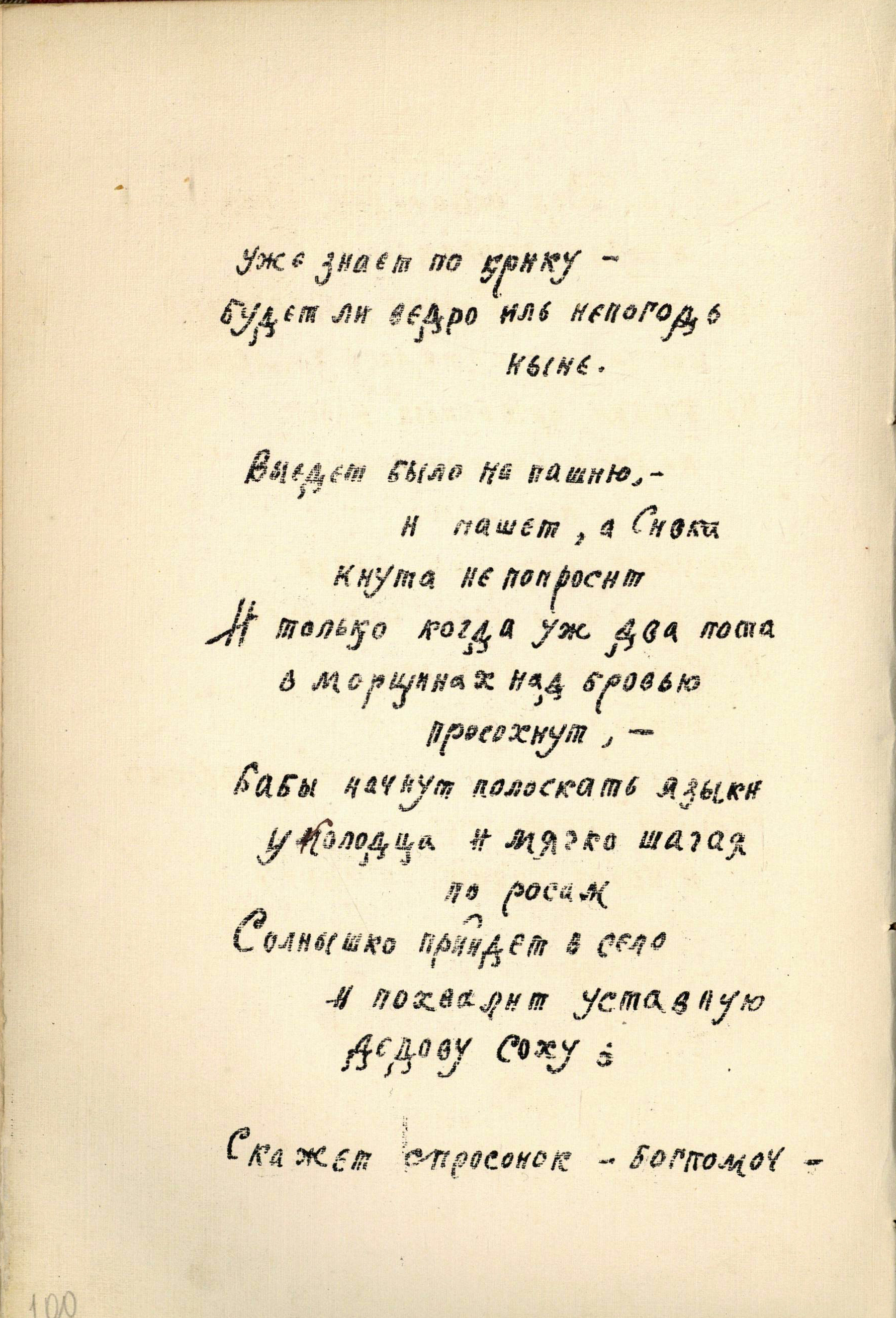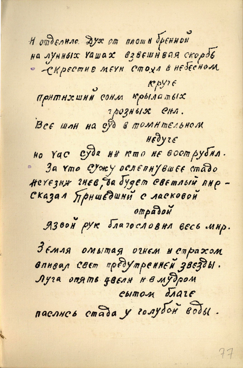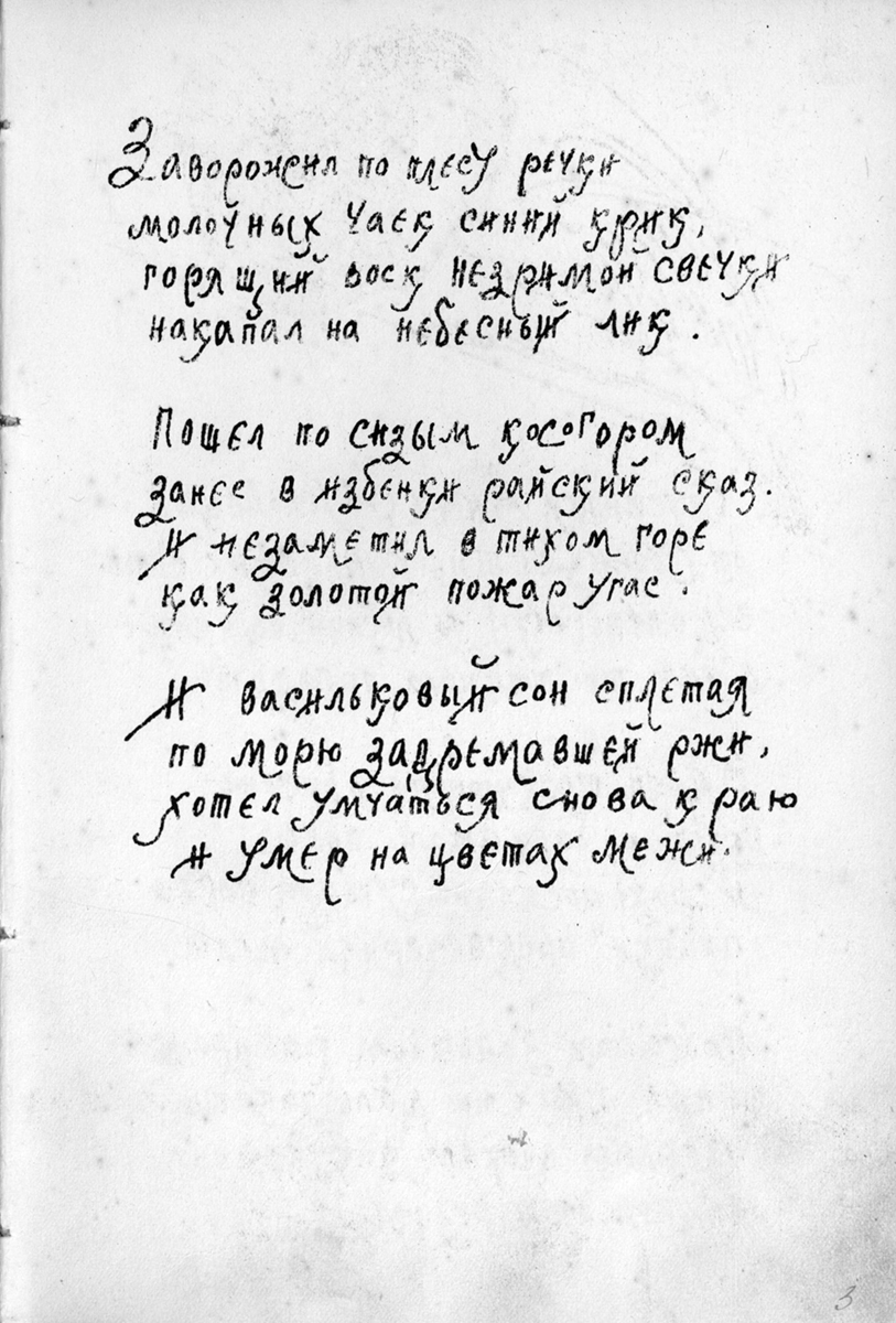 Изучение рукописи привело к неожиданным выводам, и теперь уже можно смело предполагать, что участие в создании книги принимал не один человек: Алексею Ганину кто-то помогал, поскольку очень сильно отличается почерк сборника «Золотое безлюдье», стоящий в конволюте последним, да и иллюстрации к нему носят несколько иной характер, чем в предыдущих сборниках. Почерк «Золотого безлюдья» – более строгий, без завитков, характерных для почерка Алексея Ганина. Иллюстрации этого сборника стали более насыщенными по объему и тону, они стали и более предметными (гребень, заяц, гроза – таких образных иллюстраций не было в других книгах).