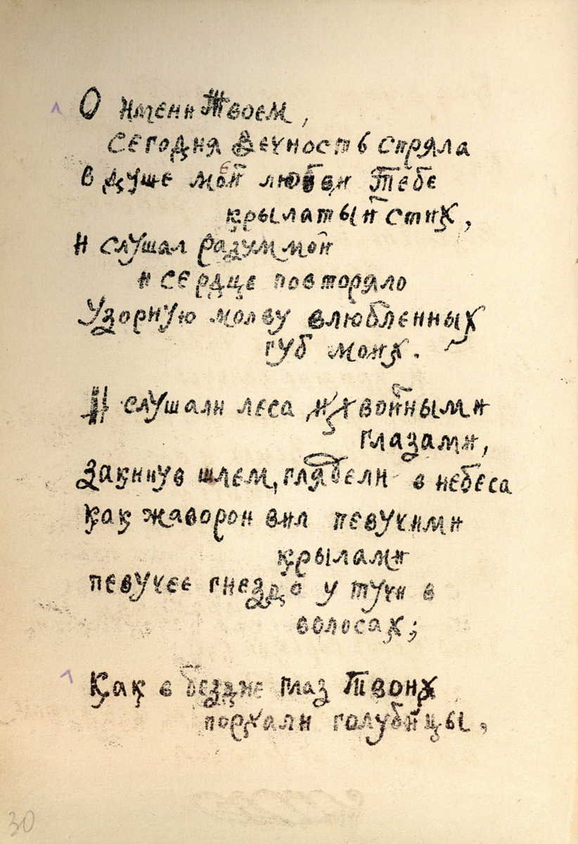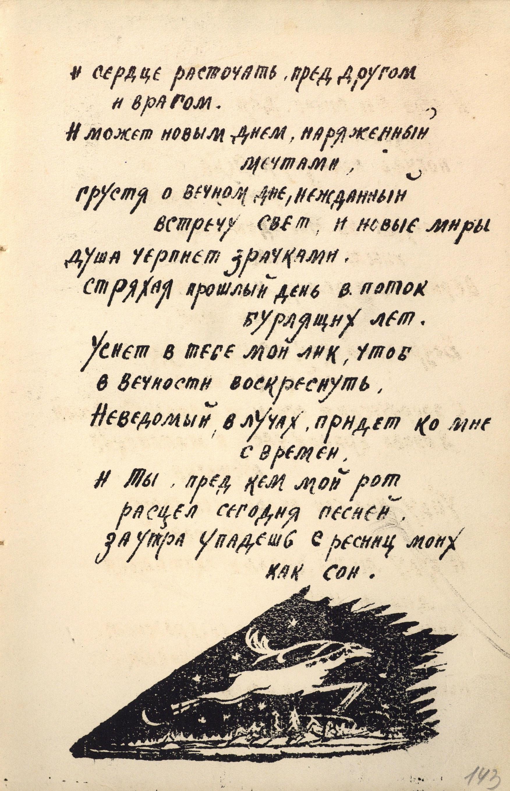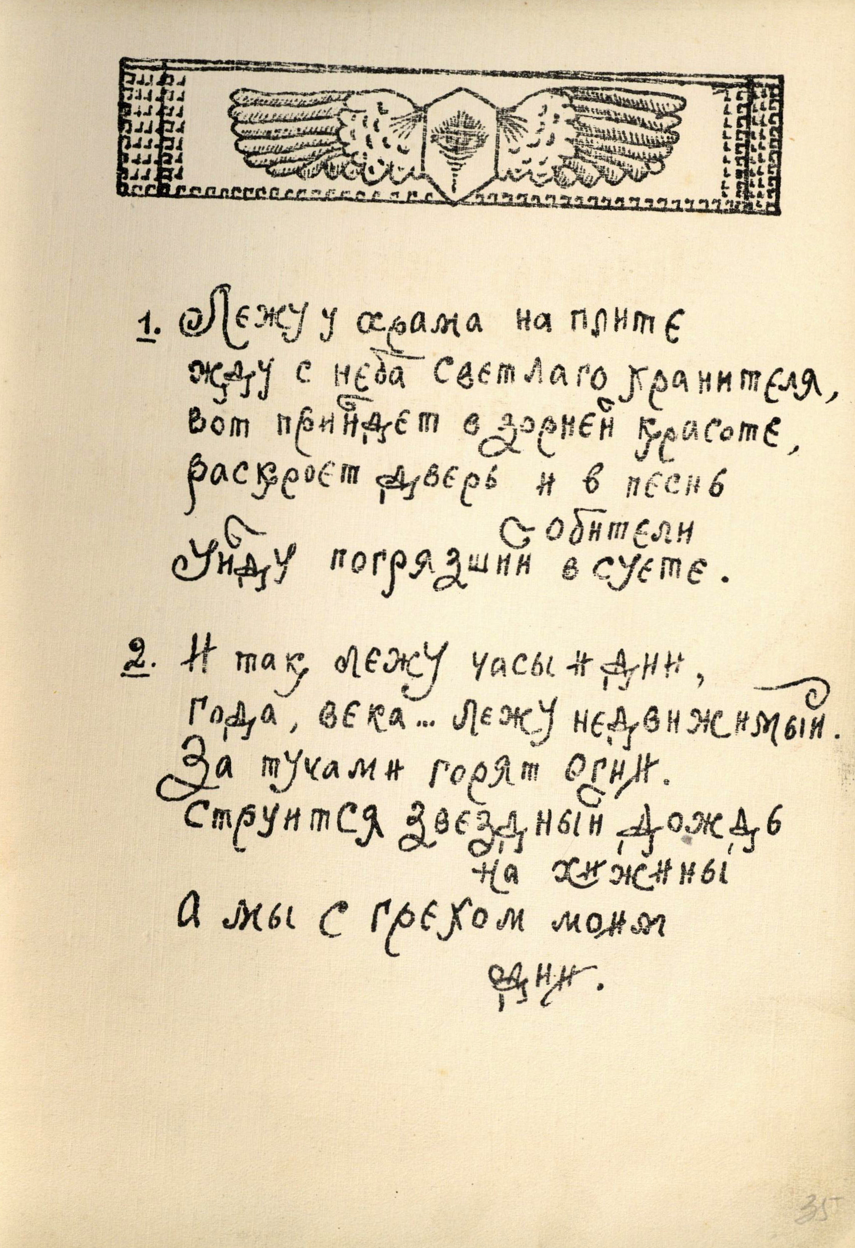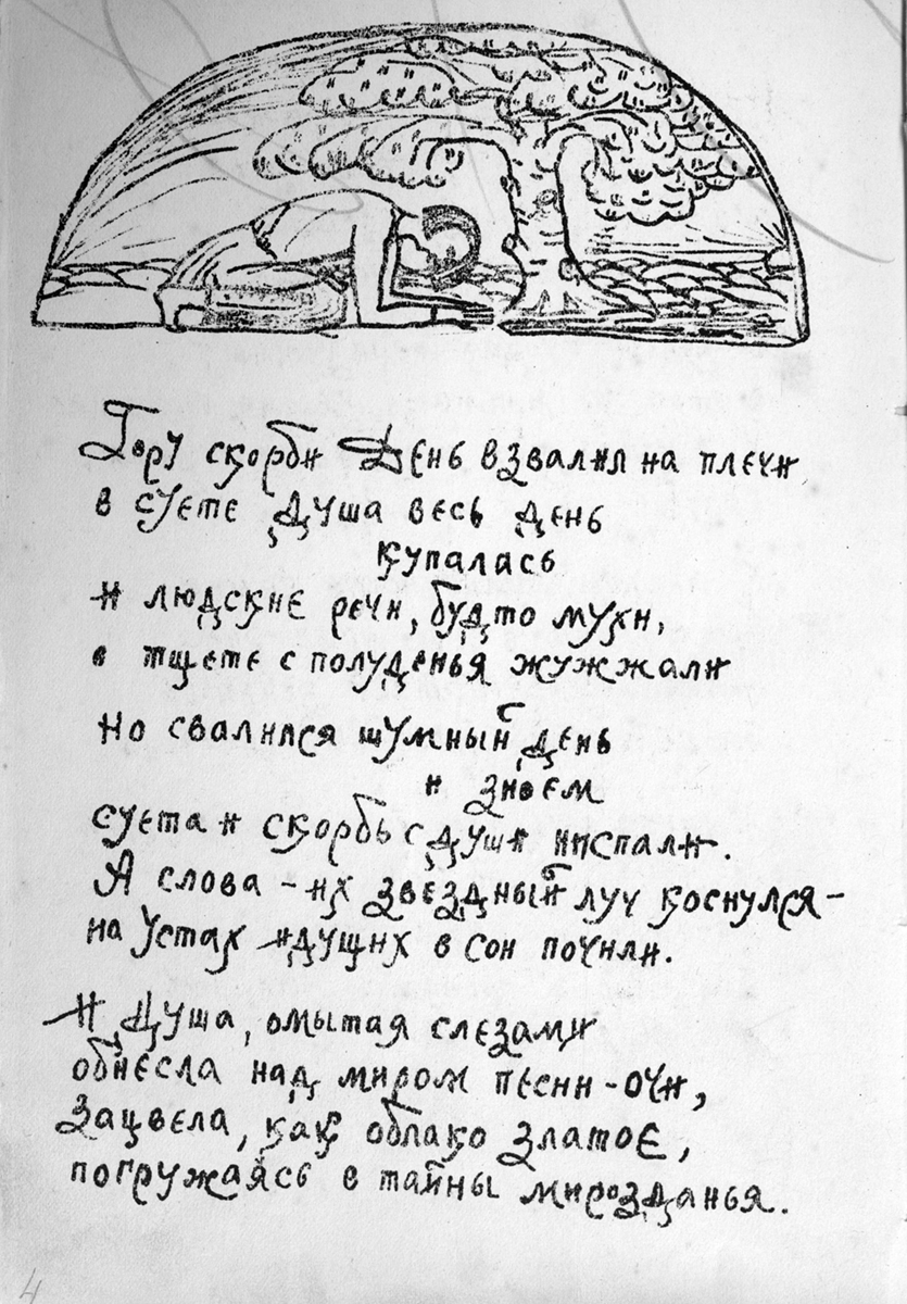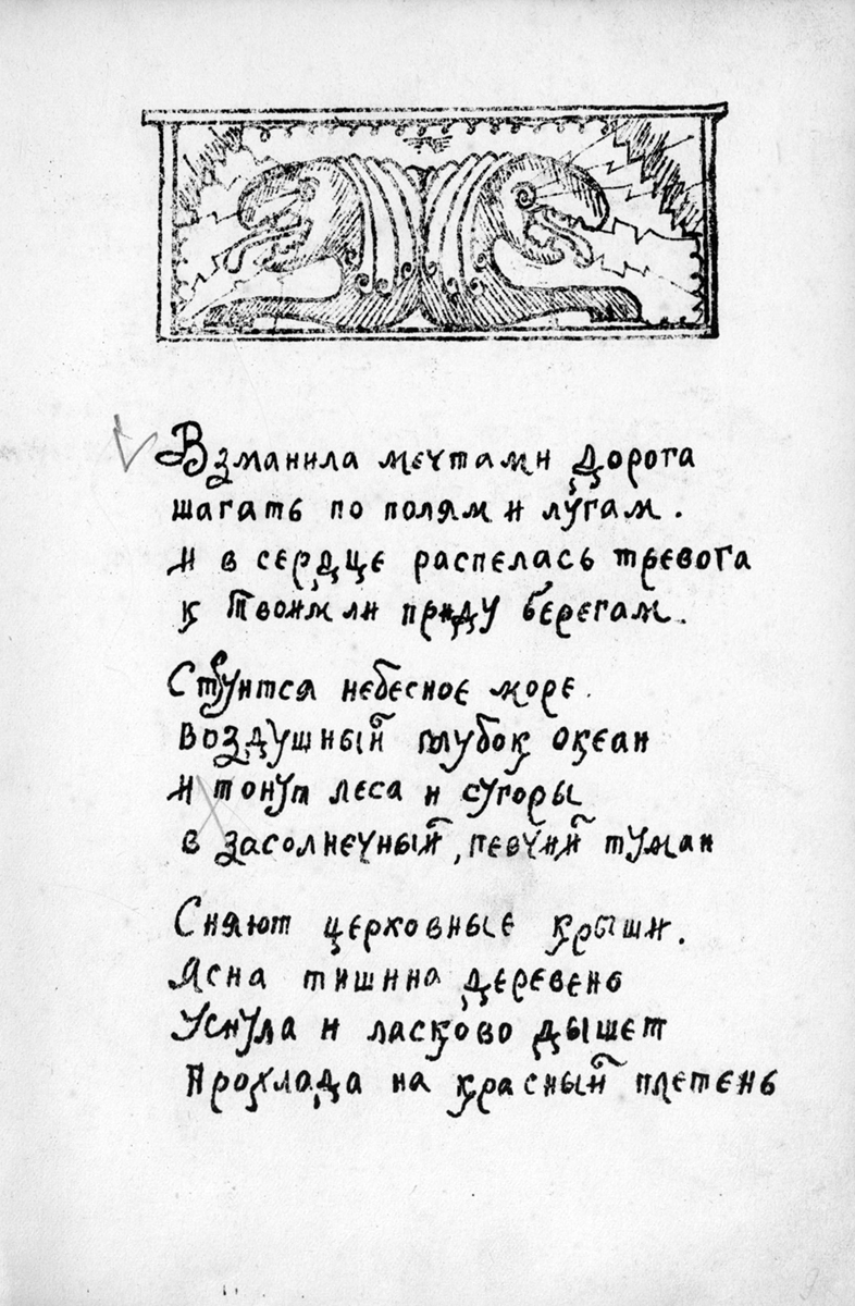 Изучение литографированных изданий 20-х годов XX века стоит в контексте исследования авторской книги лирики – интереснейшего и малоисследованного явления культуры. В истории издания поэтических сборников есть многочисленные примеры того, как поэты, «остро чувствуя выразительность самой книжной конструкции (формата, пространственного расположения текста на странице, наличия или отсутствия иллюстраций и украшений, их стиля, переплета, обложки, начертания букв из различных гарнитур шрифта, качества бумаги и т<ак> д<алее>), принимали самое деятельное участие в определении всех элементов книги, пытались обеспечить созвучие книжной конструкции созданному ими тексту» [7]. Отличие ганинских изданий от этих примеров состоит в том, что реализация замысла осуществлялась не другими лицами – художниками-графиками и полиграфистами, – а самим поэтом. В этом состоит уникальность скромных вологодских изданий.
