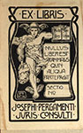 Экслибрис-наклейка выполнен в стиле модерн с изображением Меркурия, книг и совы и надписью «Nullus liber est tam malus quin aliqua parte prosit». Автор рисунка экслибриса – Lorenz M. Rheude из Регенсбурга. Исполнен в 1901 г. Техника – ксилография. Размер по обрезу – 116 х 78 мм, по изображению – 100 х 61 мм.