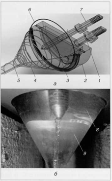 Рис. 1. Модельный вихревой эмульсор: а - схема; б - визуализация