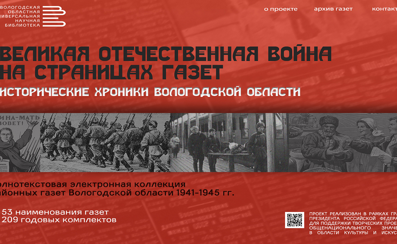 Электронный архив периодики размещен на сайте ВОУНБ в ресурсе «Великая Отечественная война на страницах газет. Исторические хроники Вологодской области». Доступ к нему свободен для всех пользователей сети Интернет: https://www.booksite.ru/gazety-1941-1945/index.html Поиск изданий осуществляется по списку районов Вологодской области и по алфавиту названий газет. В качестве иллюстраций использованы редкие снимки, на которых запечатлена жизнь Вологодской области и ее жителей в годы Великой Отечественной войны. В разделе «Обратная связь» для пользователей предусмотрена возможность оставить отзыв об электронном издании.