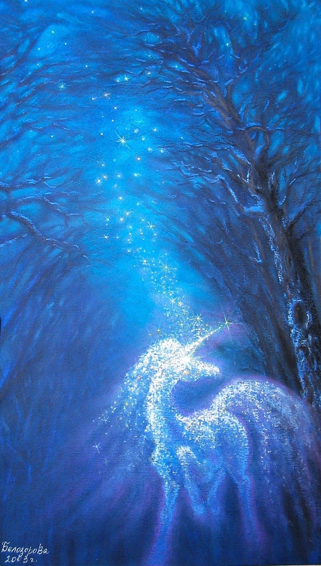 «Я иногда рисую то, что видела в реальности, например, Пинежскую пещеру, где я делала зарисовки пастелью в маленький альбомчик, пока руки не отмерзли. А иногда рисую свои сны или вообще вымышленные пейзажи. Так, рисовала отражения звезд в реке (воспоминание о реальном путешествии по Сухоне). Для некоторых сложных картин, как для летящего коня, приходилось лепить макет из пластилина и ваты, чтобы правильно изобразить падающие тени на облаках», – рассказала Елена Белозорова.