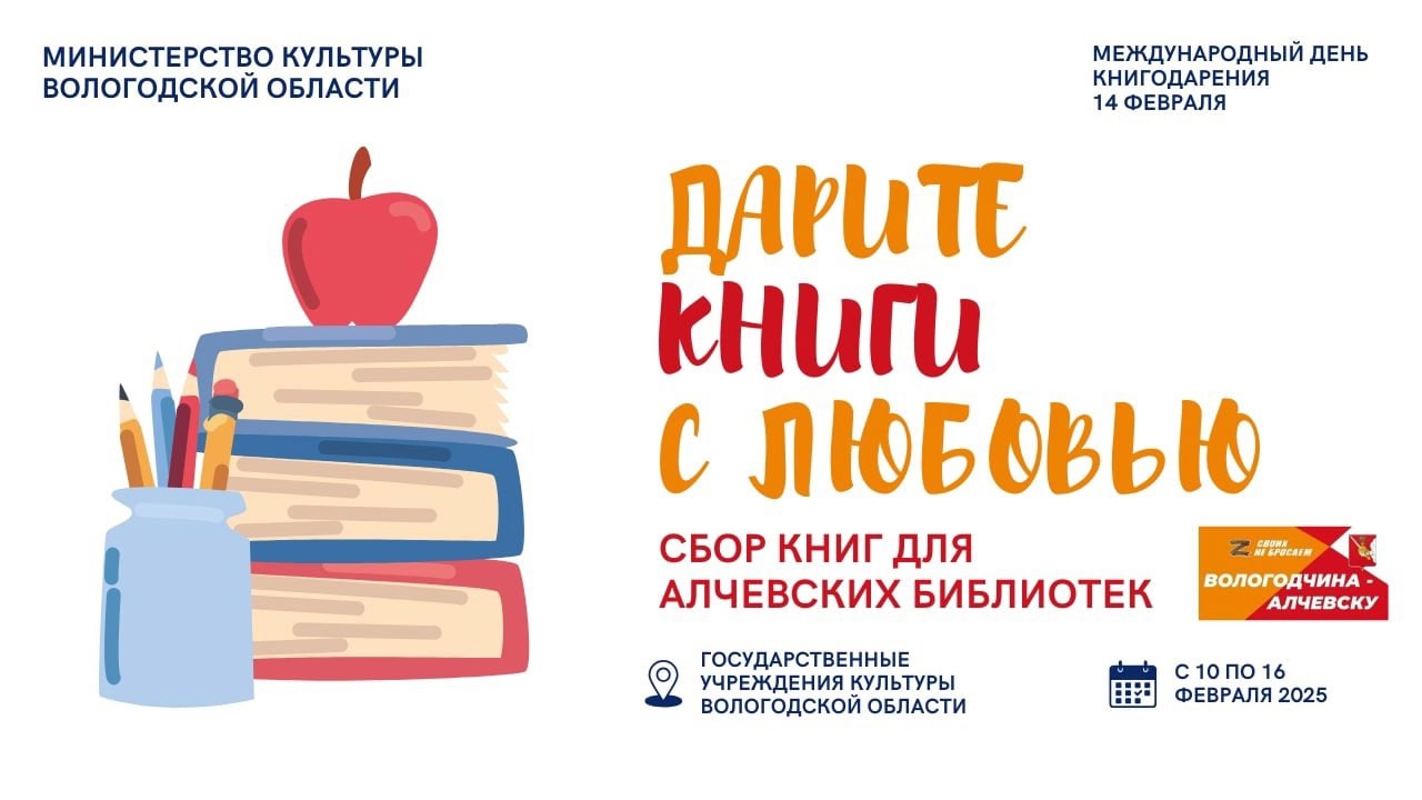 «В преддверии Дня книгодарения Министерство культуры Вологодской области объявляет акцию по сбору книг для подшефного города Алчевска Луганской Народной Республики. В ней примут участие государственные учреждения культуры региона: библиотеки, театры, музеи, концертные организации», – рассказал заместитель Губернатора Вологодской области Владимир Осиповский.