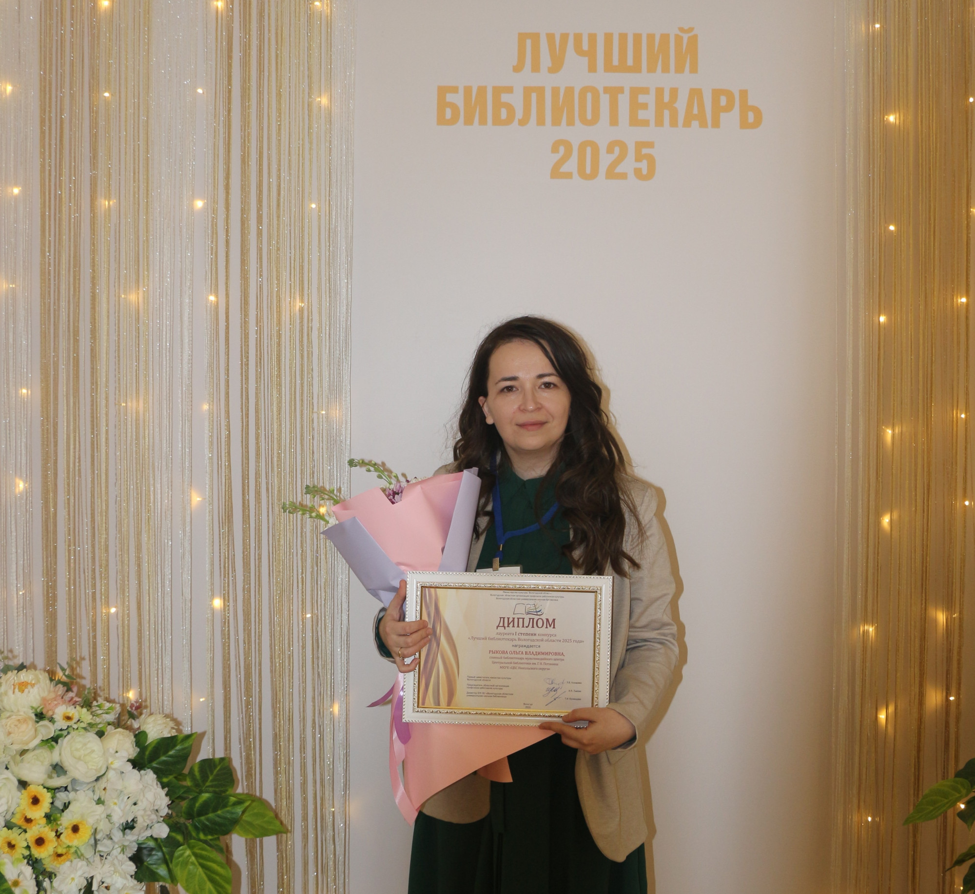 Лучшим библиотекарем Вологодской области 2025 года стала Ольга Рыкова, главный библиотекарь мультимедийного центра Центральной библиотеки имени Г. Н. Потанина (Никольск) – диплом I степени и сертификат на сумму 100 тысяч рублей;
