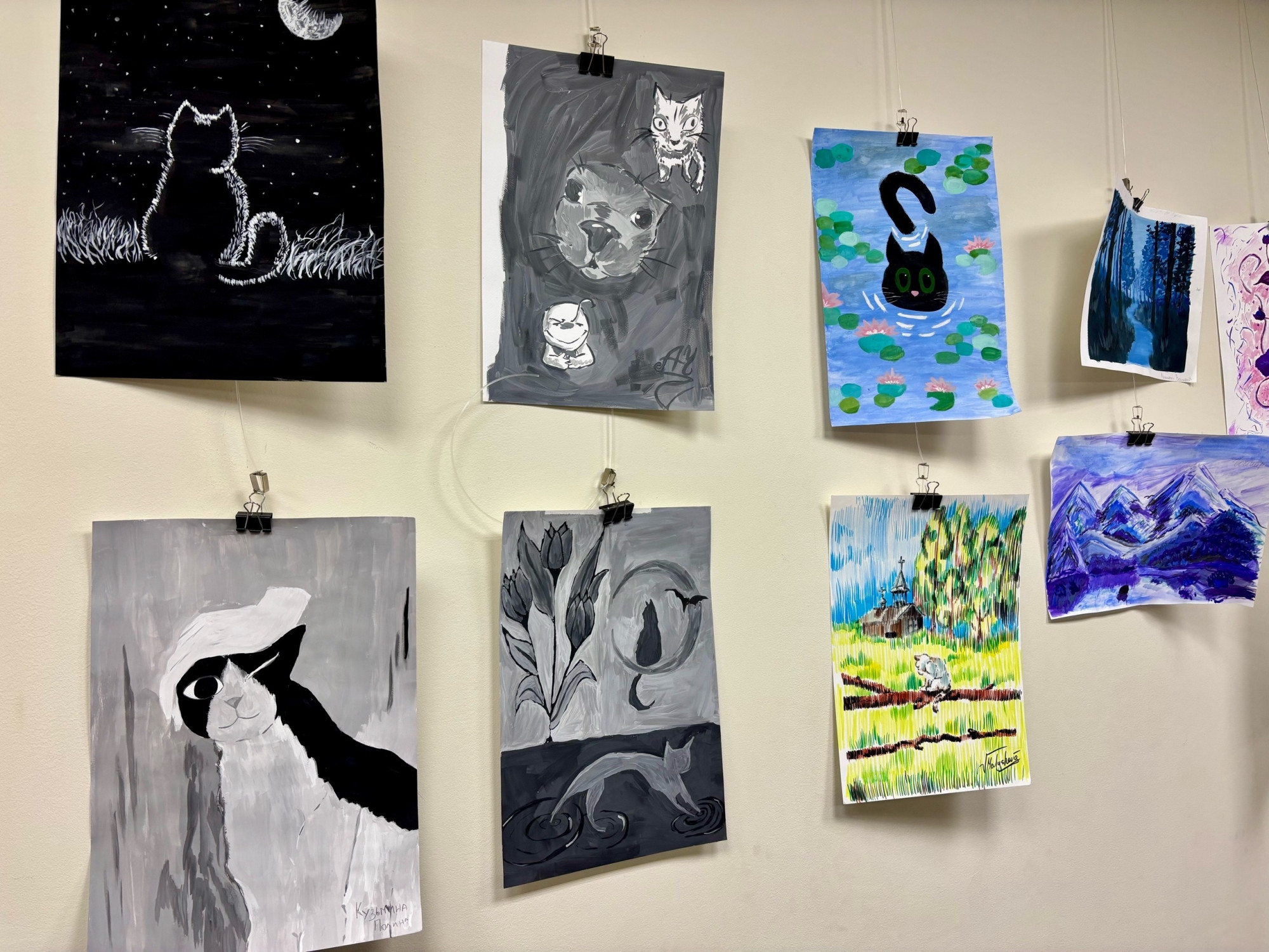 Отдельного внимания заслуживает серия работ с кошками – образы, полные характера, загадочности и живого обаяния. Эти рисунки становятся настоящим отражением непосредственного взгляда молодых художников на мир.