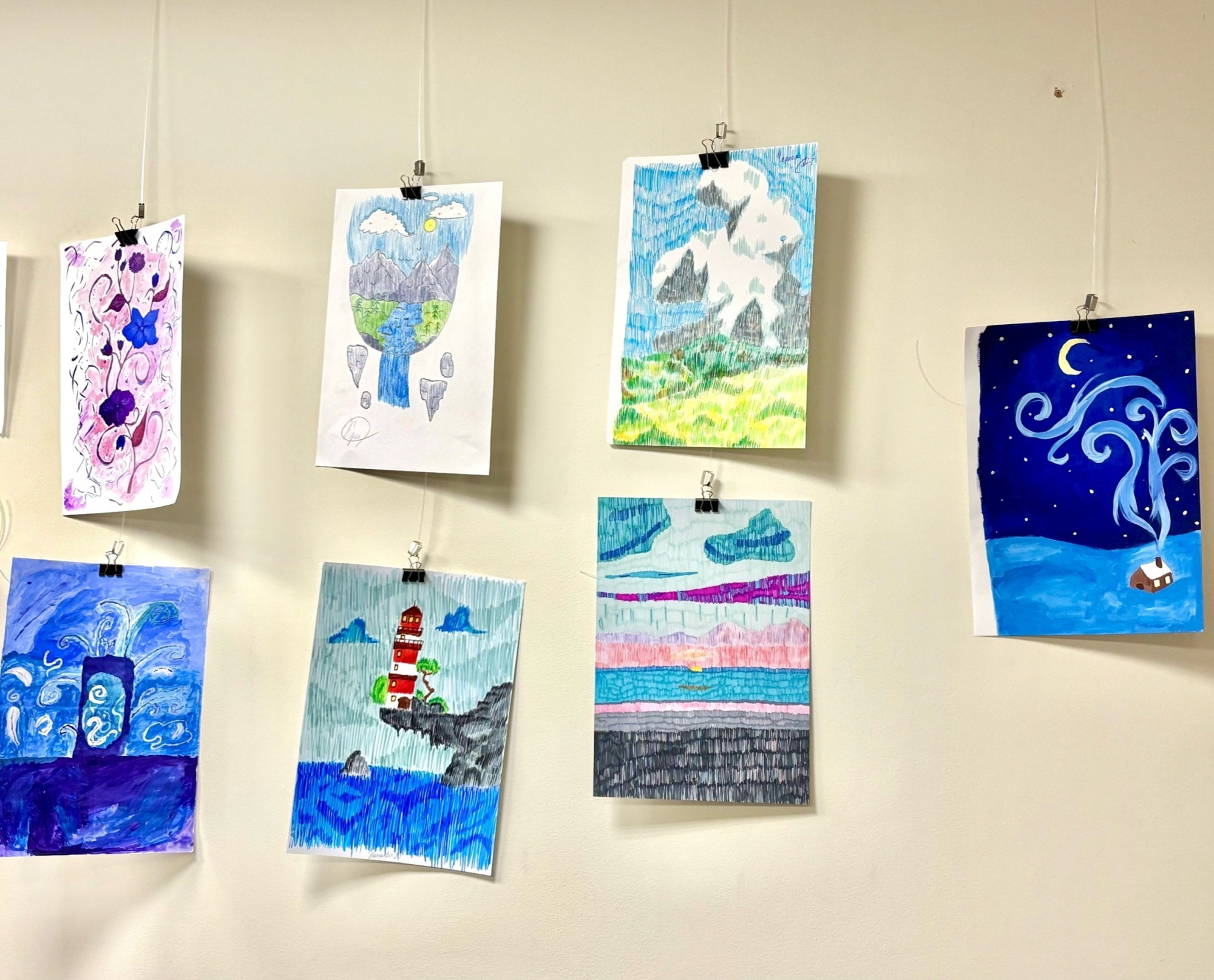 На выставке представлены разнообразные работы, отражающие как академическую подготовку, так и смелые эксперименты с формой и цветом: яркие пейзажи, в которых оживают солнечные поля с деревянными церквушками, тихие берега с домиками под лунным светом и атмосфера северной осени; академические натюрморты, выполненные карандашом: тщательно проработанные этюды стеклянных банок, демонстрирующие уверенные навыки передачи объёма, светотени и перспективы; графические композиции, созданные маркерами и фломастерами, динамичные, ритмичные, наполненные энергией и отсылающие к стилистике примитивизма.