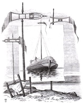 Резные украшения на мачтах некоторых хлебных судов и походные ясли на конном бичевнике. Рис. И. Тюменева.