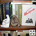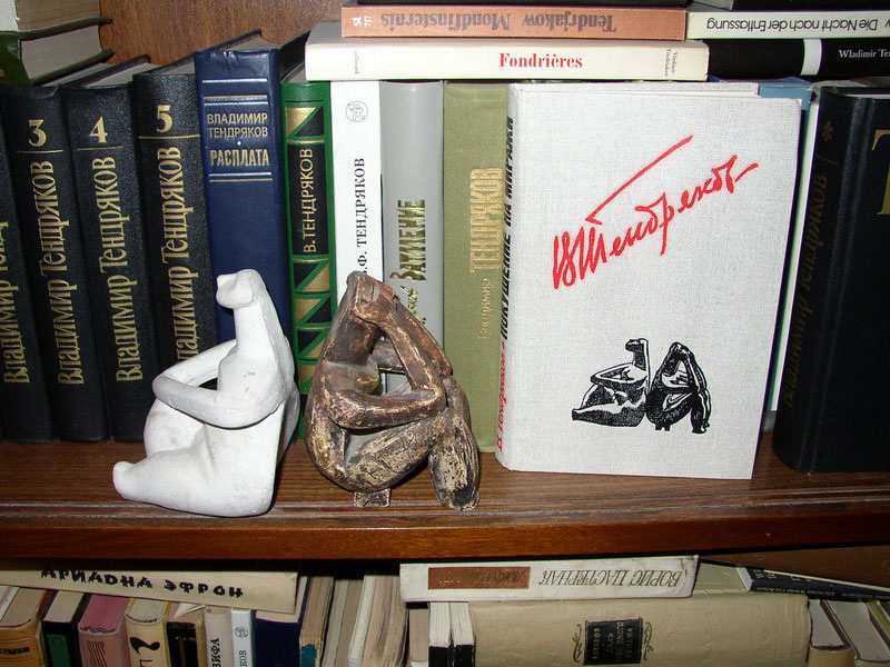 Книжная полка в кабинете и любимые фигурки «палеолитический мыслитель» и «палеолитическая Венера»