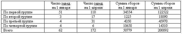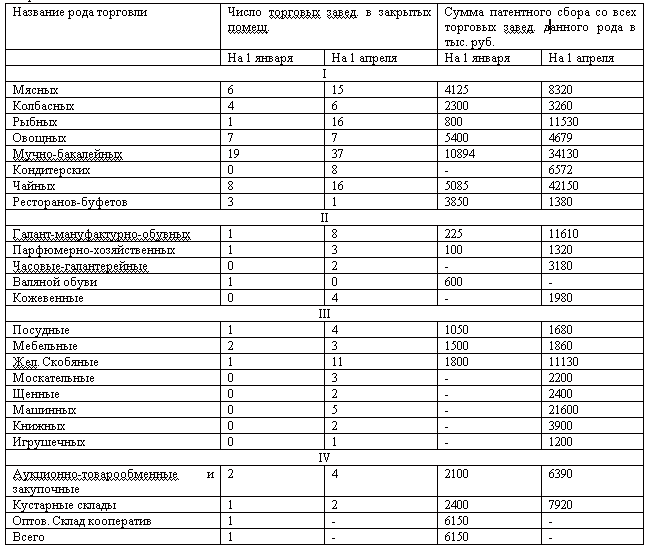 Как видно из таблицы за первые три месяца довольно значительно возросло, вообще как количество закрытых торговых заселений, так и суммы патентного сбора с них. На первом месте но числу заведений и по сумме сборов в январе стояла торговля мучно-бакалейными, овощными товарами и чайные лавки: за этим же родом торговли сохранилось первенство по сумме сборов и на 1-ое апреля, хотя к этому времени значительно возросли количественно предприятия по торговле рыбой и мясом.