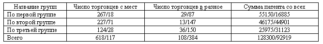 Особых пояснений к этой таблице не требуется. Что же касается торговли с мест на рынках и при посредстве торговцев в разнос, то общие цифры, несколько характеризующие мелкую торговлю, складываются следующим образом.