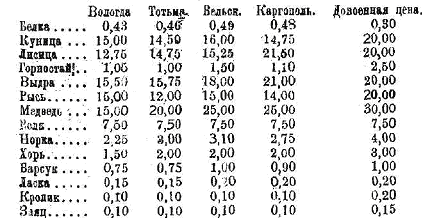 На вологодском пушном рынке заканчивается сезон белки и в полном разгаре сезон крупного зверя. Истекшее полугодие прошлого года уже дает нам возможность сделать целый ряд весьма небезынтересных выводов, дающих общее представление о конъюнктурах на вологодском пушном рынке конца 1923 года. Суммируя наши полугодовые наблюдения по обращению на местном рынке за это время основной партии пушнины количеством свыше 100.000 шт., мы делаем попытку вывода средних чистых заготовительных пушных цен по районам за все полугодие. В результате получается такая картина строения вологодских пушных цен (все цены в золоте).