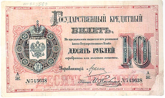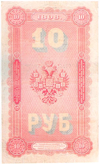 ![]() Государственный кредитный билет. 10 рублей. 1898. Размер 173х104 мм // Деньги России, 1000 лет / [А.С. Мельникова, В.В. Уздеников, И.С. Шиканова; Общ. ред.: А.С.Мельникова]. - М.: Родина: Фодио, 2000. - с. 143. |
